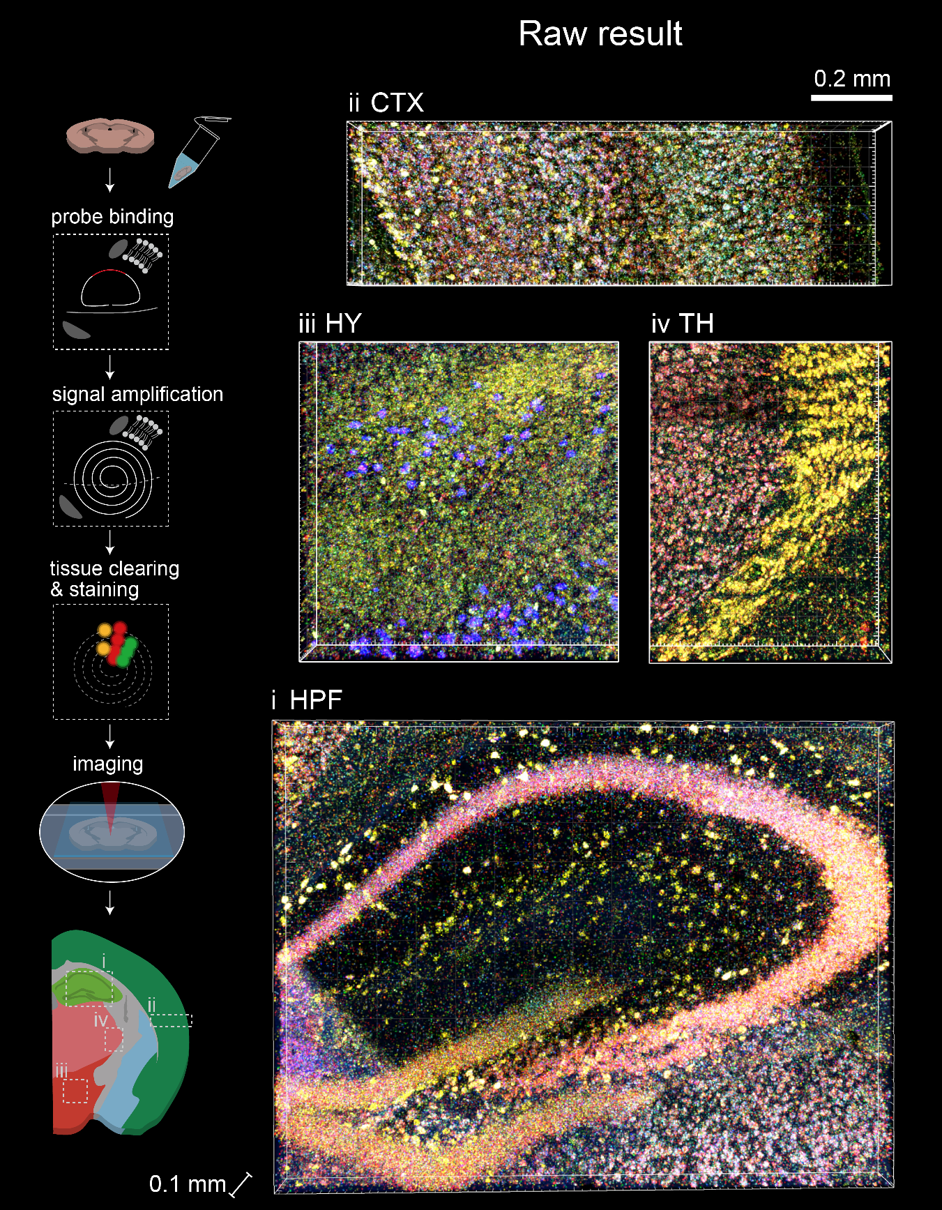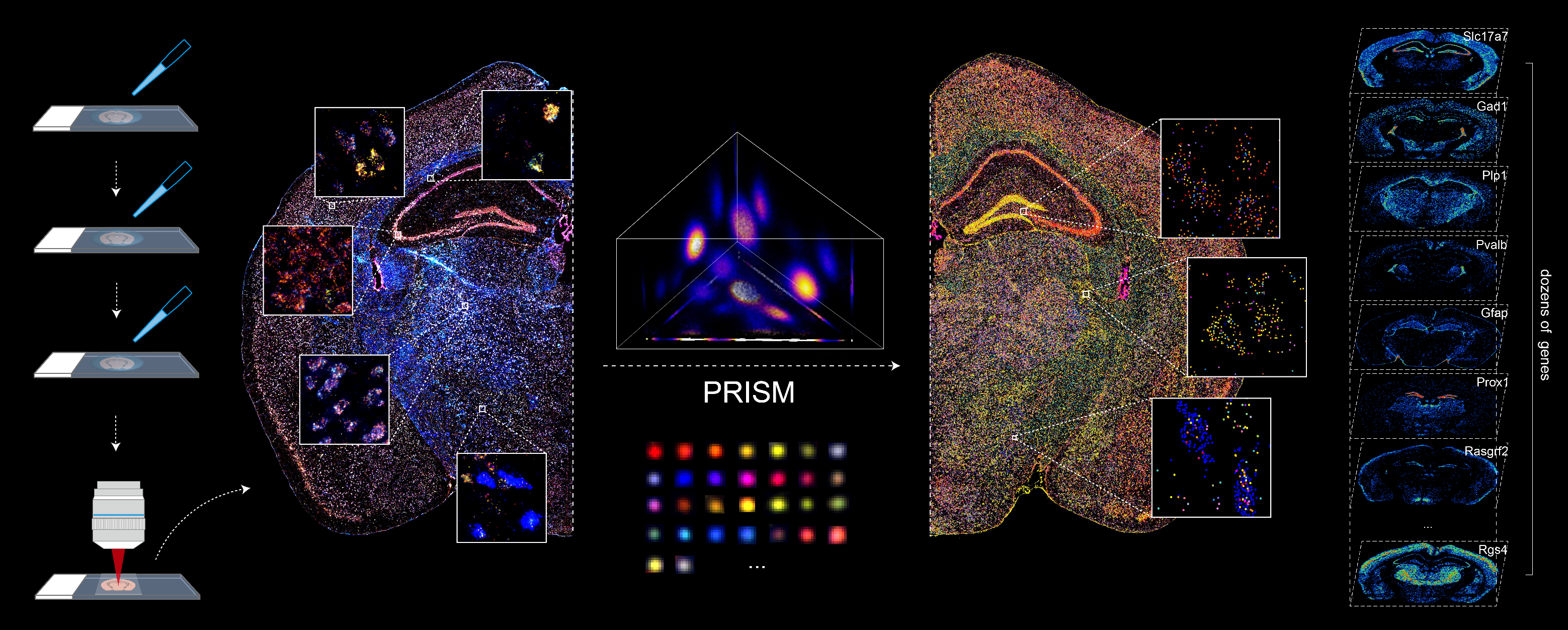 Barcoded padlock probes are designed to hybridize targeted gene transcripts and are amplified locally into clones via rolling circle amplification. Each barcode contains segments corresponding to a spectral channel, taking the spectral combination (both wavelength and intensity) for coding.
