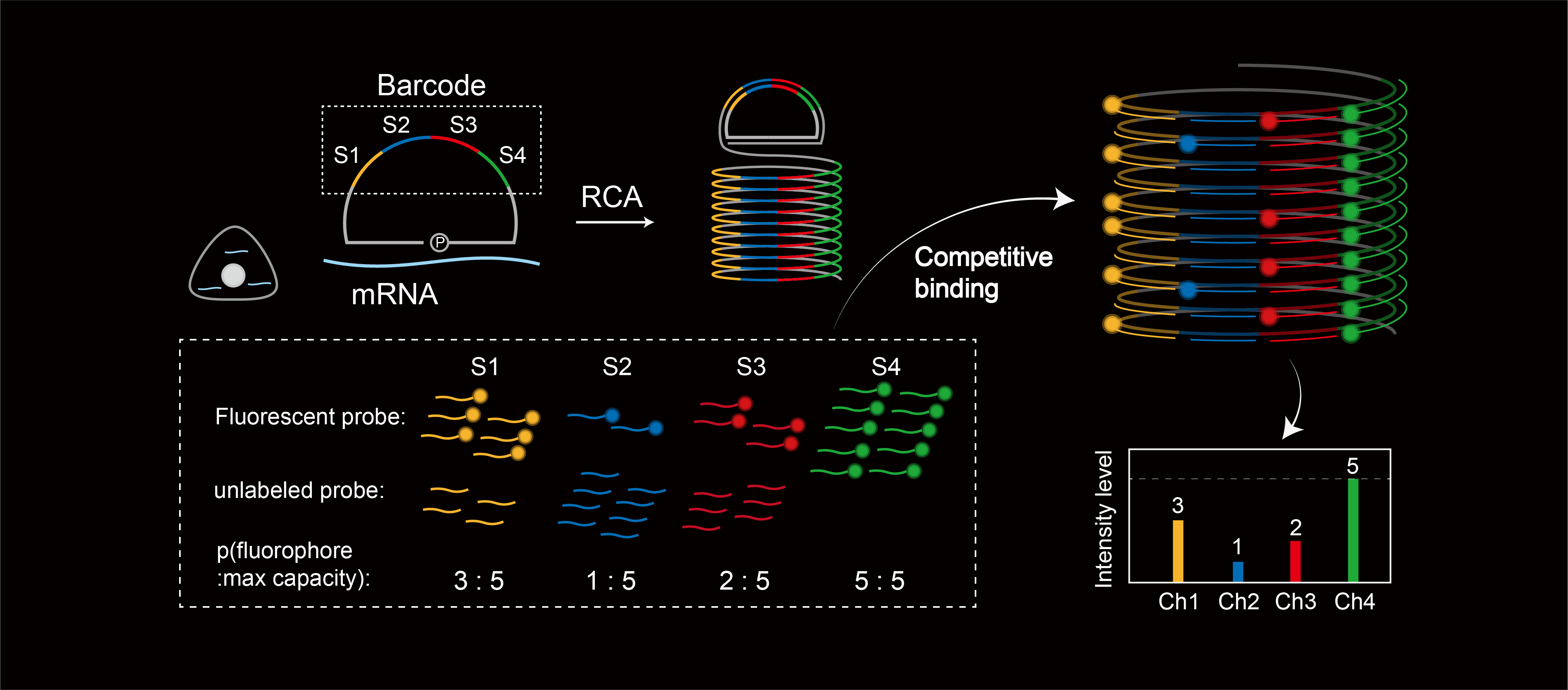 The intensity information was encoded in the ratio between fluorescently labeled and unlabeled secondary probes. Using four channels, we have experimentally verified the barcode multiplexity of up to 64 genes in a single imaging round.